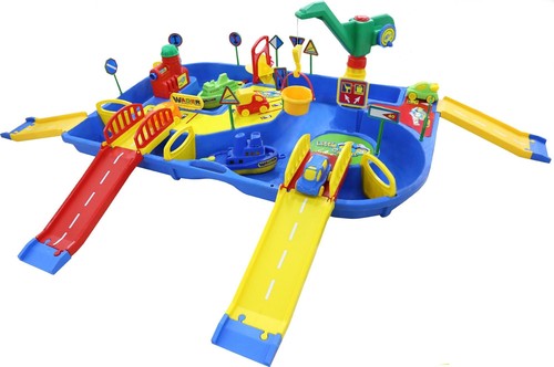 Wielki zestaw do zabawy w port, zawierający dźwigi, mosty zwodzone, samochody i statki. Wymiary po złożeniu 152x92 cm Dla dzieci w wieku od 3 lat