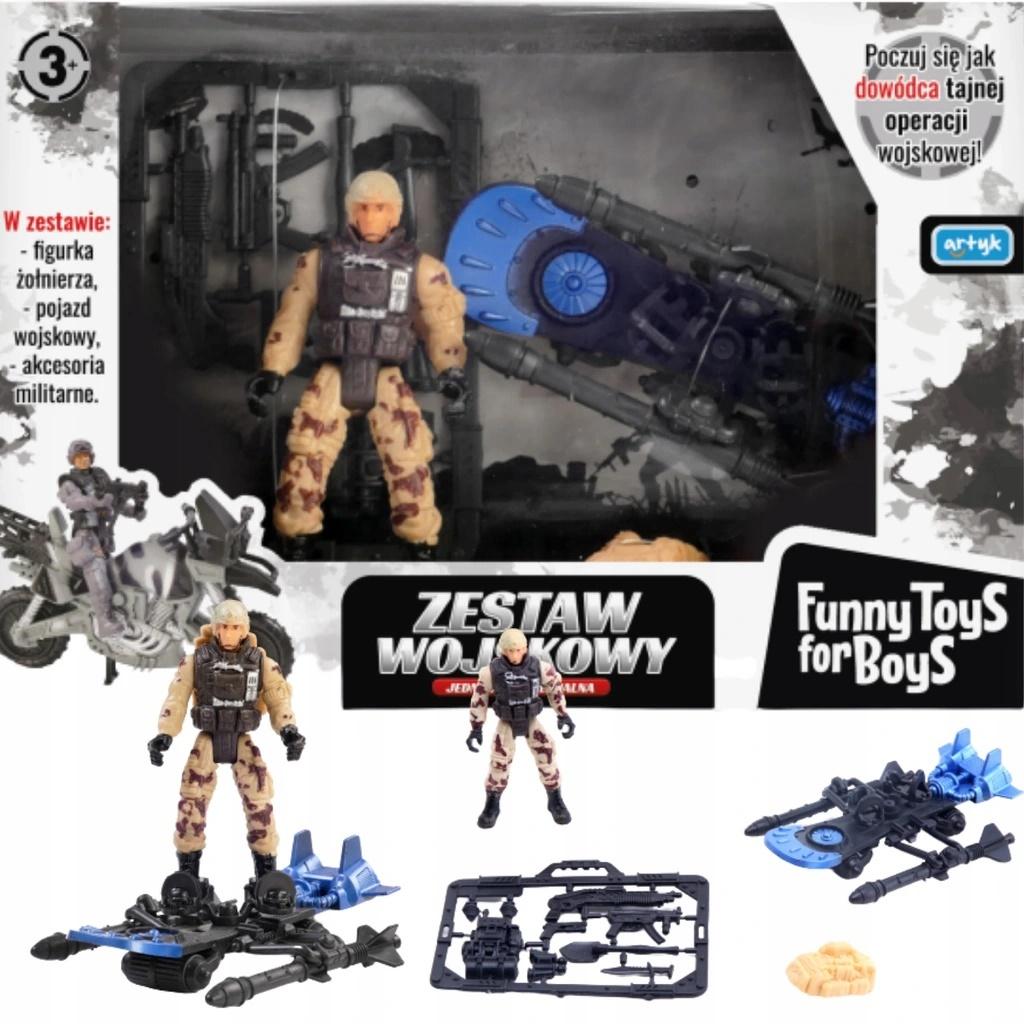 W ZESTAWIE: FIGURKA ŻOŁNIERZA OK. 11 CM., POJAZD WOJSKOWY, AKCESPRIA MILITARNE, WYM. OPK: 24 X 17 X 7 CM., 3+