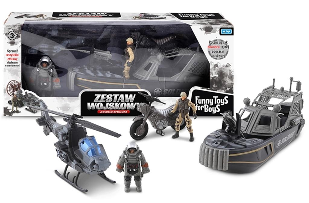W ZESTAWIE: 2 FIGURKI ŻOŁNIERZY OK. 11 CM., ŁÓDŹ MOTOROWA, HELIKOPTER, MOTOCYKL, AKCESORIA WOJSKOWE, WYM. OPK: 53 X 20,5 X 15 CM., 3+