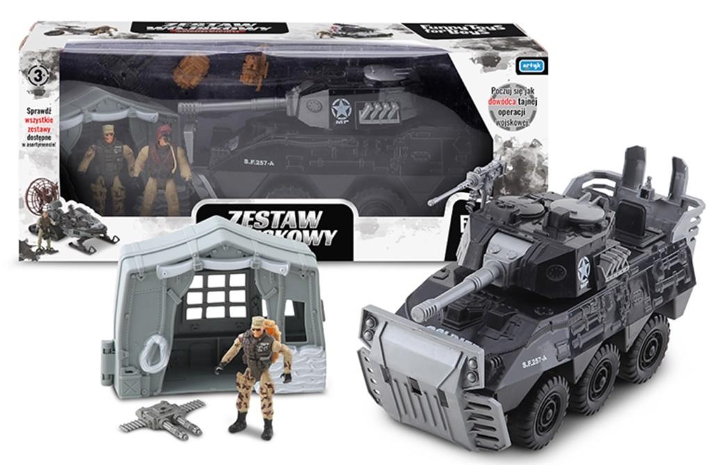 W ZESTAWIE: 2 FIGURKI ŻOŁNIERZY OK. 11 CM., CZOŁG Z OBROTOWĄ WIEŻYCZKĄ, NAMIOT WOJSKOWY, AKCESORIA WOJSKOWE, WYM. OPK: 53 X 20,5 X 15 CM., 3+