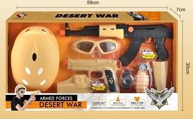 Zestaw wojskowy, który zawiera: kask, 2 pistolety, okulary, zegarek, granat. Produkt nie potrzebuje baterii. Zabawka przeznaczona dla dzieci powyżej 3 roku życia.