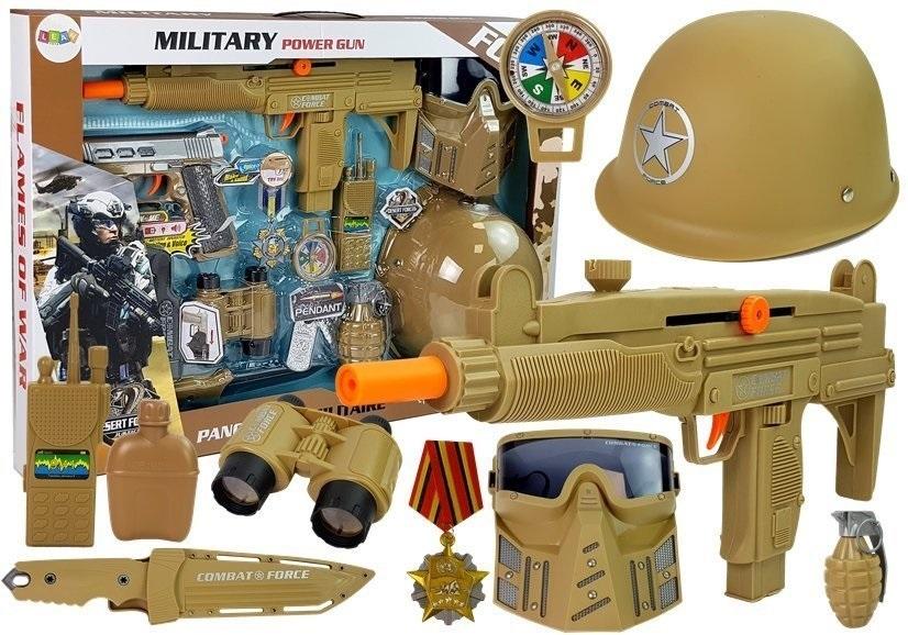 Zestaw Wojskowy Pistolety Broń z Maską Hełmem Granat Dźwięk Militarne zabawki, wojskowe elementy to zazwyczaj figurki żołnierzyków imitujące pole walki lub pistolety na kulki. Filmy akcji inspirują twórców zabawek, cieszą się też one coraz większym zainteresowaniem wśród naszych milusińskich. Powstaje coraz więcej zabawek, które przyciągają swoją funkcjonalnością i różnorodnością. Nasz zestaw zachwyci nie jednego fana gadżetów militarnych i będzie uzupełnieniem stroju podczas balu przebierańców. Całość utrzymana jest w kolorystyce jasnej zieleni. Pistolety wydają dźwięki strzałów jeden za drugim, wystarczy nacisnąć spust, wycelować i pal. W czasie tych czynności można zauważyć efekty świetlne na broni. Żaden złoczyńca nie ucieknie! Akcesoria również umożliwiają zabawę dwójce dzieci - jedno z nich może zostać wyposażone w hełm, lornetkę oraz mały pistolet natomiast drugie z nich może założyć maskę bojową i wyposażyć się w długi gumowy nóż, granat i duży pistolet. Wszystko zależy od wyobraźni malucha. Największą zaletą zestawu wojskowego jest jego rozmiar i liczba elementów. Zestaw dla młodego wojskowego składa się z wielu elementów. Wszystkie wykonane są z wysokogatunkowego tworzywa, co jest gwarancją, że będą służyć dziecku przez długi czas. Elementy zestawu: - pistolet duży - pistolet mały - kabura na pistolet - odznaka - maska - hełm - granat - lornetka - nóż - kompas - nieśmiertelnik - walkie talkie Wymiary wybranych elementów zestawu: - pistolet duży: 37 cm x 16 cm x 3 cm - pistolet mały: 19 cm x 13 cm x 3 cm - maska: 16 cm x 15 cm x 5 cm - hełm: średnica -22,5 cm, głębokość - 10 cm , długość paska- 30 cm - nóż: 25 cm x 5 cm Wymiary pudełka: 61 cm x 41,5 cm x 5,5 cm Pistolet zasilany jest trzema bateriami AG13 1.5V (w zestawie). Zabawki przeznaczone są dla dzieci powyżej 3. roku życia. Zestaw posiada certyfikat CE i jest zgodny z normą EN 71. Zestaw zapakowany jest w kartonowe pudełko, dzięki czemu nadaje się idealnie na prezent.