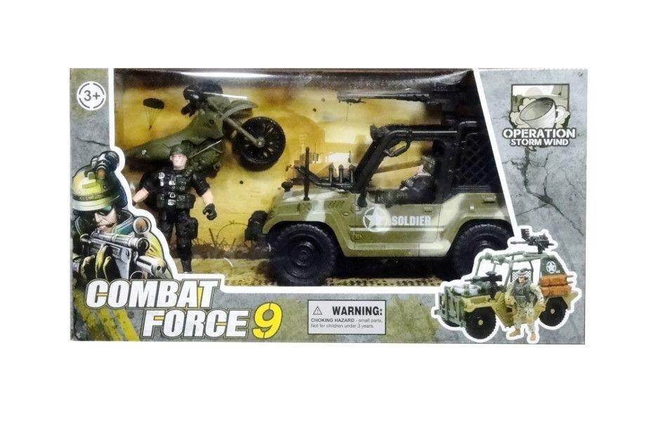 Zestaw wojskowy dla chłopców. W opakowaniu: motor, auto terenowe i 2 figurki żołnierzy. Produkt zapakowany w kartonowe opakowanie z przezroczystym okienkiem. Zabawka dla dzieci od 3 lat. Podane wymiary są wymiarami opakowania.