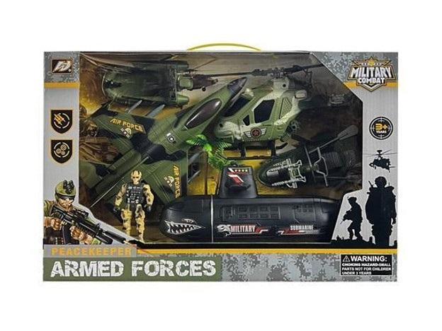 Zestaw wojskowy dla chłopców. W opakowaniu: łódź podwodna, motorówka, helikopter, samolot, ponton i figurka żołnierza. #&Produkt zapakowany w kartonowe opakowanie z przezroczystym okienkiem. #&Zabawka dla dzieci od 3 lat. #&Podane wymiary są wymiarami opakowania.
