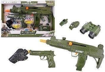 W zestawie: karabin, pistolet, lornetka, kabura, granat, gwizdek, Funkcje: karabinek: po naciągnięciu przegrody pocisku i naciśnięciu spustu słychać dźwięk imitujący wystrzały z broni automatycznej, pistolet: po naciśnięciu spustu słychać dźwięk imitujący wystrzał, Pozostałe informacje: dł. karabinu 37 cm, wym. opak. 42 x 27,5 x 4,7 cm, 3+