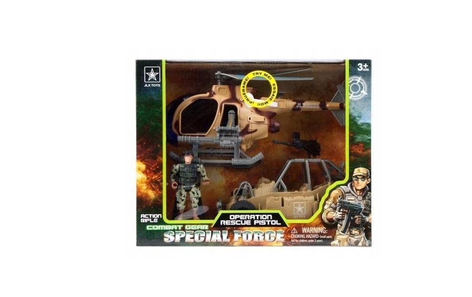 Żołnierz to równie popularny zawód wśród grupy małych dzieci, co policjant. Zabawa Zestawem Wojskowym MEGA CREATIVE dostarczy każdemu dziecku sporą dawkę dobrej zabawy i rozbudzi jego kreatywność! W zestawie znajdują się: Helikopter, samochód Jeep wojskowy oraz figurka żołnierza. Helikopter posiada efekty dźwiękowe. Wymagane zasilania bateriami 3x AG13 - załączonymi do zestawu.