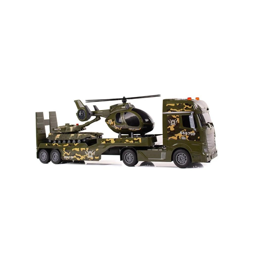 Przygotuj się na pełną emocji akcję w zaciszu swojego salonu! Nasz zestaw Samochód ciężarowy z naczepą, na której umieszczony jest helikopter i czołg wojskowy to zabawka, która wprowadzi Twoje dziecko w świat wojskowych przygód i militariów. Dzięki dokładnemu odwzorowaniu, klasyczna zieleń i czarne elementy z napisami wojskowymi sprawią, że maluch poczuje się jak prawdziwy żołnierz. Zestaw posiada liczne funkcje za