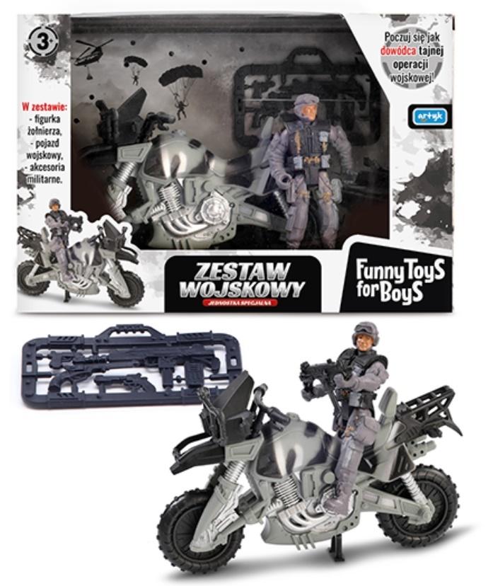 W ZESTAWIE: FIGURKA ŻOŁNIERZA OK. 11 CM., MOTOR, AKCESORIA WOJSKOWE, WYM. OPK: 24 X 17 X 7 CM., 3+