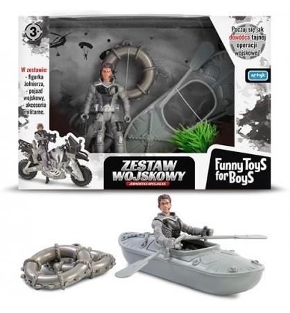 W ZESTAWIE: FIGURKA ŻOŁNIERZA OK. 11 CM., PONTON Z WIOSLAMI, 2 KOLA RATUNKOWE, AKCESORIA, WYM. OPK: 24 X 17 X 7 CM., 3+