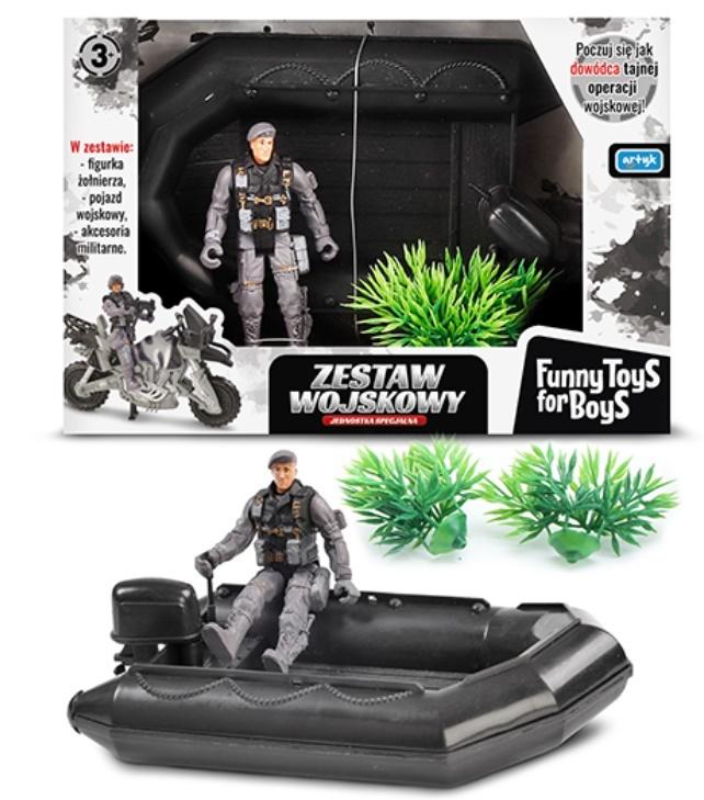 W ZESTAWIE: FIGURKA ŻOŁNIERZA OK. 11 CM., PONTON, AKCESORIA, WYM. OPK: 24 X 17 X 7 CM., 3+