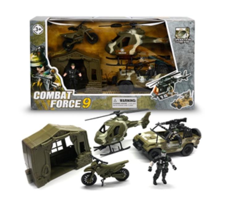 W ZESTAWIE: HELIKOPTER WOJSKOWY, MOTOCYKL, AUTO, NAMIOT, 2 FIGURKI ŻOŁNIERZY, WYM. OPK: 51 X 28 X 12 CM., 3+