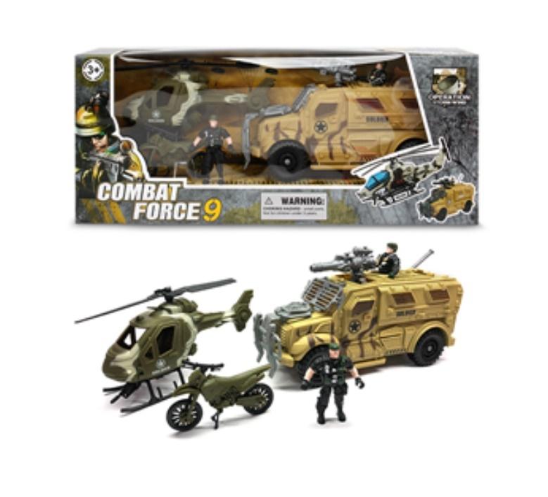 W ZESTAWIE: OPANCERZONY WÓZ TRANSPORTOWY, MOTOR, HELIKOPTER, 2 ŻOŁNIERZY, WYM. OPK: 57 X 23 X 14,5 CM., 3+