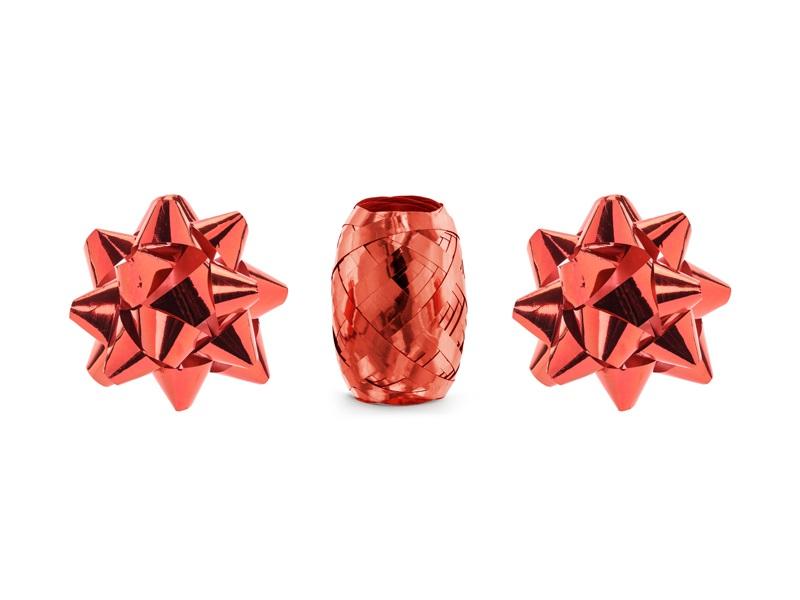 Wstążka i 2 rozety plastikowe metalizowane w kolorze czerwonym. Wymiary wstążki: szerokość ok. 5 mm, długość ok. 10 m, średnica rozety ok. 7 cm.(1 op. / 3 szt.)