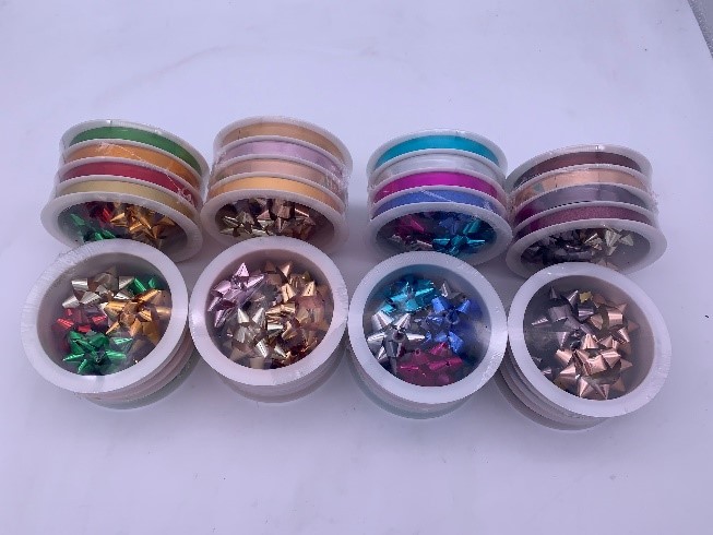 Opakowanie Zestaw wstążek z rozetkami - 4 wstążki: 1cm x 4m + 6 rozetek 4cm.