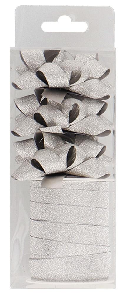 Opakowanie Zestaw wstążka brokatowa 1cm x 10m + 3 rozetki 6cm. Srebrna