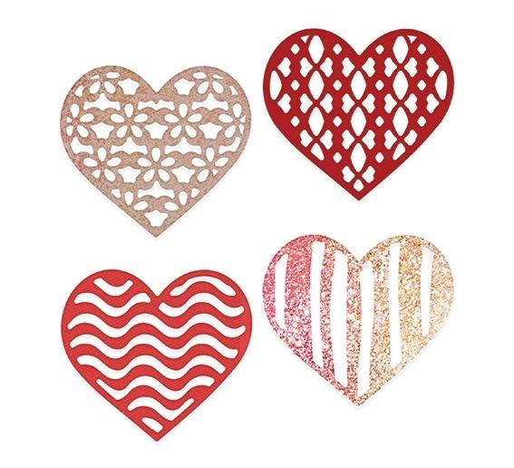 Zestaw wykrojników złożony z czterech wzorów ażurowych serc do tworzenia unikatowych prac z papieru, tektury i pianki.