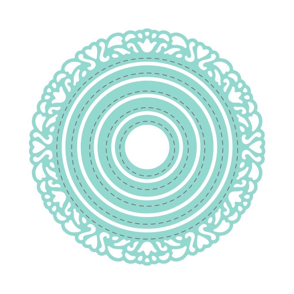 Cztery wykrojniki w kształcie kół z efektem ręcznych przeszyć i ozdobnym ornamentem, które dodadzą delikatności i lekkości ręcznie robionym projektom.
