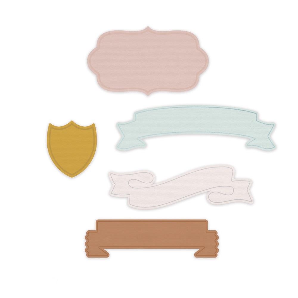 Zestaw pięciu wykrojników w kształcie szyldów, tarcz i wstęg w różnych rozmiarach.