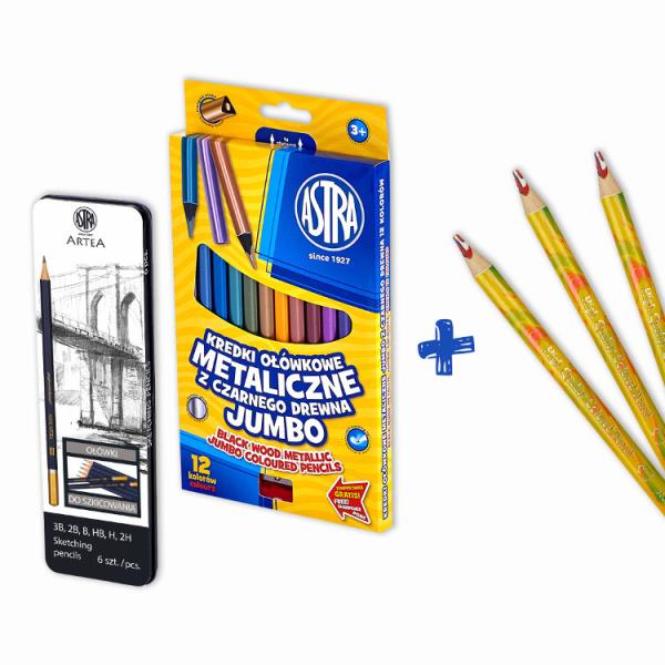 Świetny zestaw artystyczny z kredkami metalicznymi, ołówkami do szkicowania i kredkami tęczowymi. Doskonały dla małych miłośników rysowania.