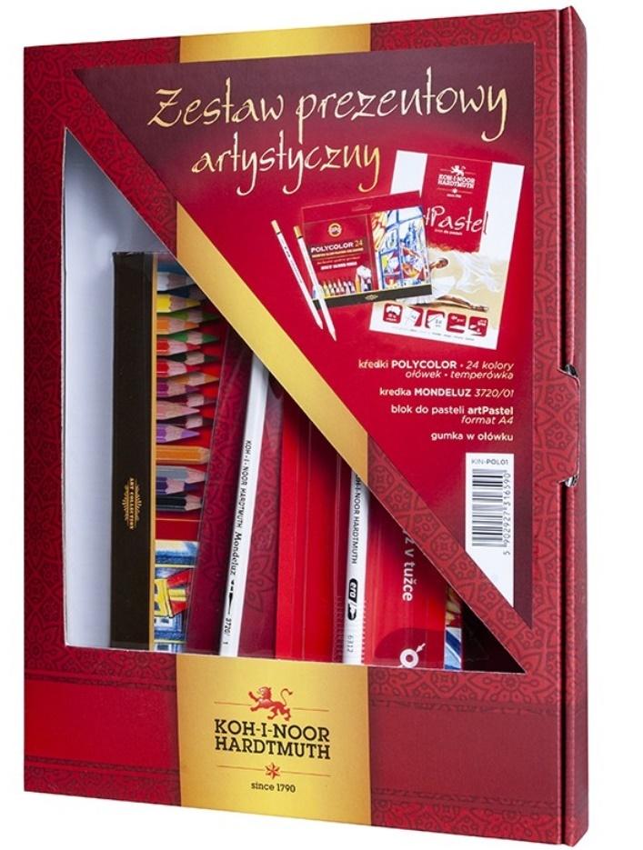 Zestaw prezentowy artystyczny spakowany w ozdobne, kartonowe pudełko. W skład zestawu wchodzą: kredki POLYCOLOR 24 kolory, kredka MONDELUZ biała, gumka w ołówku oraz blok do pasteli ArtPastel sepia A4.