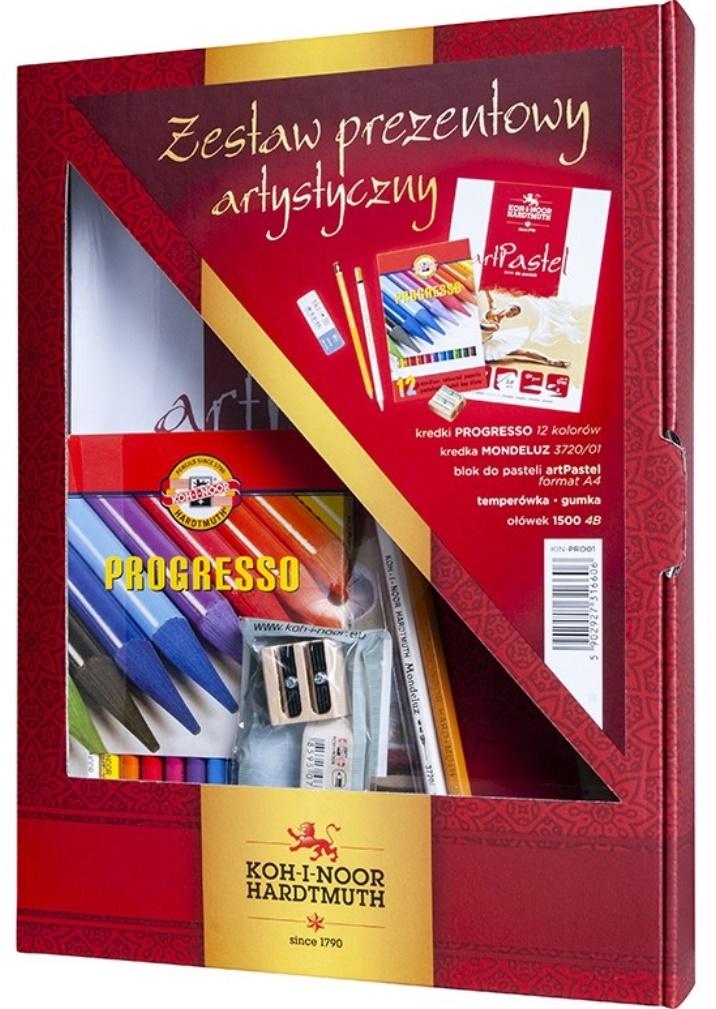 Zestaw prezentowy artystyczny spakowany w ozdobne, kartonowe pudełko. W skład zestawu wchodzą: kredki PROGRESSO 12 kolorów, kredka MONDELUZ biała, ołówek 1500 4B, gumka, temperówka oraz blok do pasteli ArtPastel sepia A4.