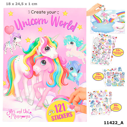 W zestawie 121 naklejek, bajkowe plansze, jednorożce, Minimoomisy i cała masa zabawy dla dzieci!