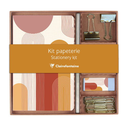 Zestaw z notesem w linie marki Clairefontaine. Wzór z kolekcji Terracotta. Zawartość: - notes 11x17 cm z 32 kartkami w linie - ołówek - 2 metalowe klipy - 10 spinaczy biurowych - 1 gumkę do ścierania Zainspirowana aktualnymi trendami w zakresie „Slow Living" i self-care, kolekcja Terracotta przenosi nas w kojący świat, w którym organiczne formy i ciepłe barwy harmonijnie przeplatają się. Odcienie terakoty, ochry i beżu zaczerpnięte z natury tworzą przytulny nastrój.