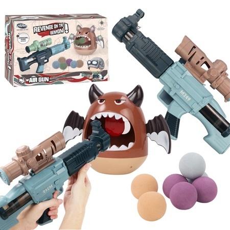 W skład zestawu wchodzi uroczy potworek oraz pistolet na piłeczki.
