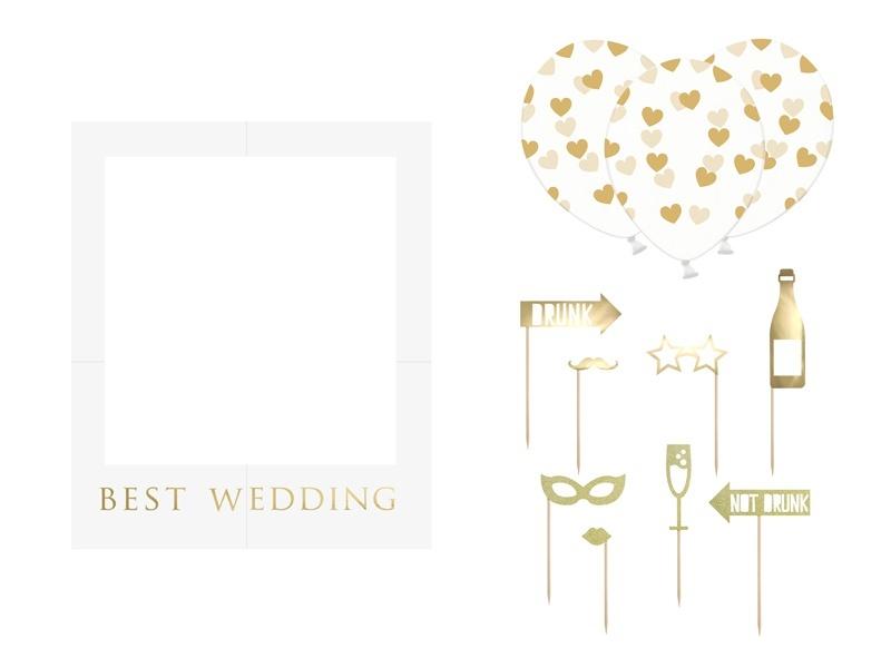Zestaw z ramką do selfie, zestaw zawiera: białą ramkę ze złotym napisem Best Wedding (wymiary po złożeniu ok. 50 x 59,5 cm, 1 szt.), gadżety do zdjęć w kolorze złotym (wysokość po złożeniu ok. 21 - 42 cm, 8 szt.), transparentne balony w złote serca (rozmiar ok. 30 cm, 3 szt.) i ok. 3 m złotego sznurka.