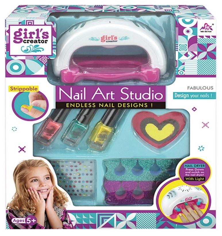 3 lakiery (łatwe zdejmowanie), naklejki do zdobienia paznokci, 2 separatory, pilniczek do paznokci, suszarka do paznokci