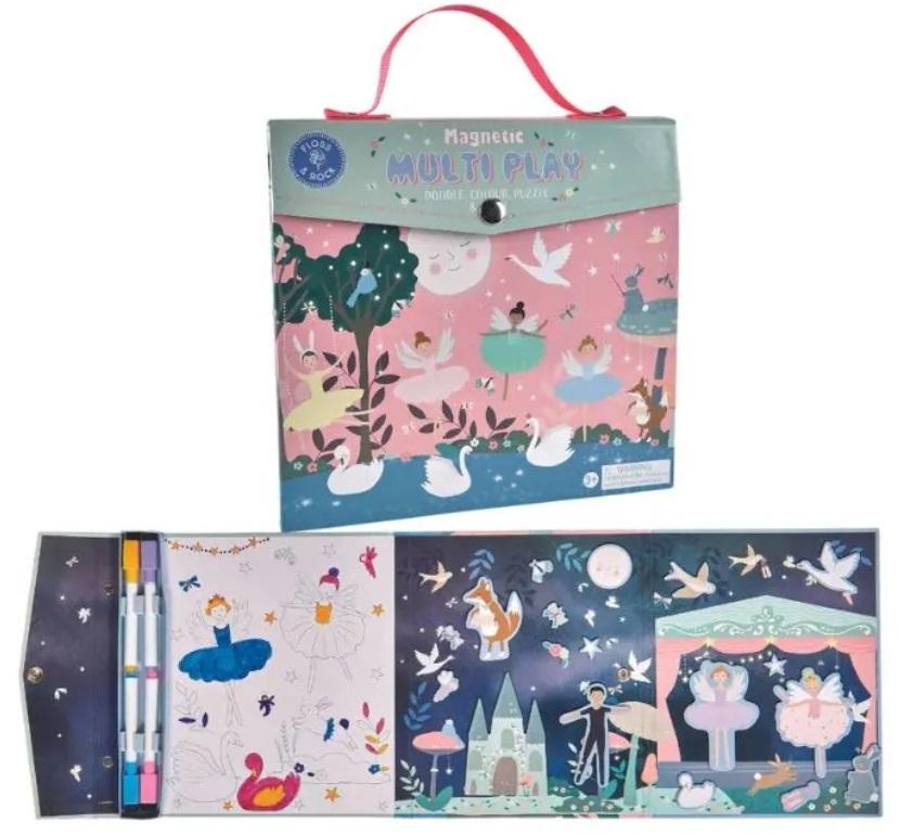 Układaj puzzle, rysuj, koloruj i baw się! Zestaw Magnetyczny Baletnice to cztery ulubione i popularne zabawy w jednym pudełku, które gwarantują dzieciom świetną i kreatywną zabawę na wiele godzin. Po rozłożeniu zestaw odsłania atrakcyjną układankę składającą się z 20 magnetycznych elementów, 4 kolorowe pisaki z gumkami do wycierania na sucho, plansze do rysowania i pisania oraz magnetyczne baletnice, tancerki, łabędzie i kolorowe ptaki do niekończącej się zabawy na planszy magnetycznej. Pudełko składa się na płasko i jest wyposażone w poręczny uchwyt do przenoszenia, dzięki czemu idealnie sprawdza się w podróży oraz do zabawy na świeżym powietrzu.                                      Cechy: