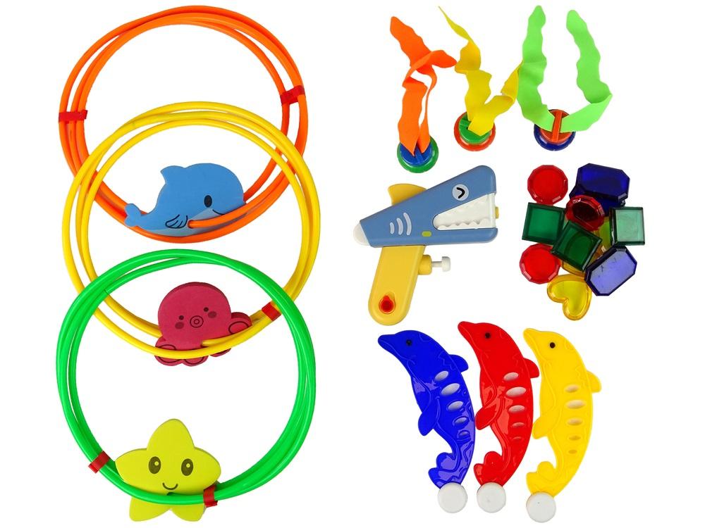 Zestaw Zabawek Do Nauki Nurkowania Hula Hop Zestaw ten to doskonały sposób na połączenie frajdy i nauki podczas zabawy w wodzie. Oferuje on mnóstwo możliwości, aby dzieci mogły czerpać radość z pływania, doskonalić umiejętności nurkowania i rozwijać zdolności manualne. W jego skład wchodzi różnorodna kolekcja elementów, która zapewnia różnorakie i angażujące doświadczenia. Trzy plastikowe delfinki, stanowią wyzwanie do zanurzania i wyławiania. 3 kolorowe, podwodne 'kwiaty' falujące na dnie basenu i idealnie nadają się na dekorację basenu. Dziesięć różnokolorowych, plastikowych kamieni, zachęca dzieci do eksplorowania i kreowania własnych gier. W zestawie znajduję się pistolet na wodę w kształcie rekina oraz 3 koła Hula Hop o średnicy 70 cm służące do nauki nurkowania poprzez przepływania przez nie. Są one w kolorach: pomarańczowe z delfinkiem, zielone z gwiazdką oraz żółte z ośmiorniczką. Zestaw ten nie tylko dostarcza rozrywki, ale także pomaga w rozwijaniu umiejętności motorycznych, koordynacji ruchowej i koncentracji. Wykonany z trwałego plastiku, sprawia, że jest odpowiedni do użytku w wodzie. Nurkowanie oraz pływanie staje się teraz fascynującą i edukacyjną przygodą, która łączy naukę z radością i aktywnością fizyczną. Elementy zestawu: - 3 koła Hula Hop - pistolet na wodę rekin - 3 plastikowe delfiny - 12 plastikowych kamieni Wymiary opakowania: 33 cm x 35 cm x 12 cm Posiada certyfikat CE, ponadto jest zgodny z normą EN71. Zabawka przeznaczona jest dla dzieci powyżej 3 roku życia.