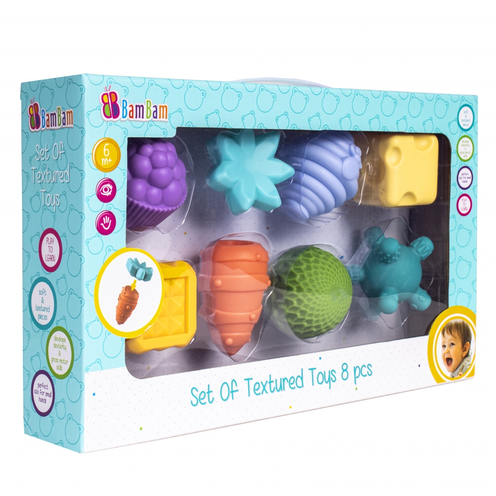 Zestaw 8 miękkich i barwnych figur sensorycznych Bam Bam dla dzieci od 6 m-ca,  zachęca dzieci do aktywnej zabawy, będącej jednocześnie ćwiczeniem stymulującym zmysł dotyku i doznań sensorycznych. Zabawki sensoryczne o zróżnicowanych kształtach, w tym smakowitej marchewki czy muffinka, żywej kolorystyce, oraz  niejednolitej fakturze są idealnie wyprofilowane dla małych rączek, łatwo je chwytać oraz trzymać. Dzięki różnorodności form zabawek można kreować wiele ćwiczeń, modyfikując stopień trudności w zależności od wieku i umiejętności dziecka. Zabawka doskonale sprawdza się w rozbudzaniu zmysłu dotyku, zdolności manualnych, poznania polisensorycznego,  a także w treningu skupiania uwagi. Doskonali koordynację pomiędzy świadomym chwytaniem, a widzeniem, a także usprawnia zdolności manualne. Wymiary/waga/baterie: wymiary produktu (śr.)[cm]: 5-8 cm, wymiary opakowania (dł. x wys. x gł.)[cm]: 36x22x7, waga produktu bez opakowania [kg]: 0,24 kg, waga produktu w opakowaniu [kg]: 0,45 kg, nie wymaga zasilania bateriami. Zabawka przeznaczona dla dzieci w wieku: 6m+. Pakowana w kartonik z okienkiem.