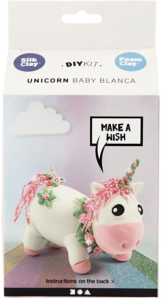 Zestaw ze wszystkimi materiałami potrzebnymi do stworzenia zabawnej figurki jednorożca przy użyciu jedwabistej masy plastycznej, piankowej masy plastycznej oraz innych akcesoriów.