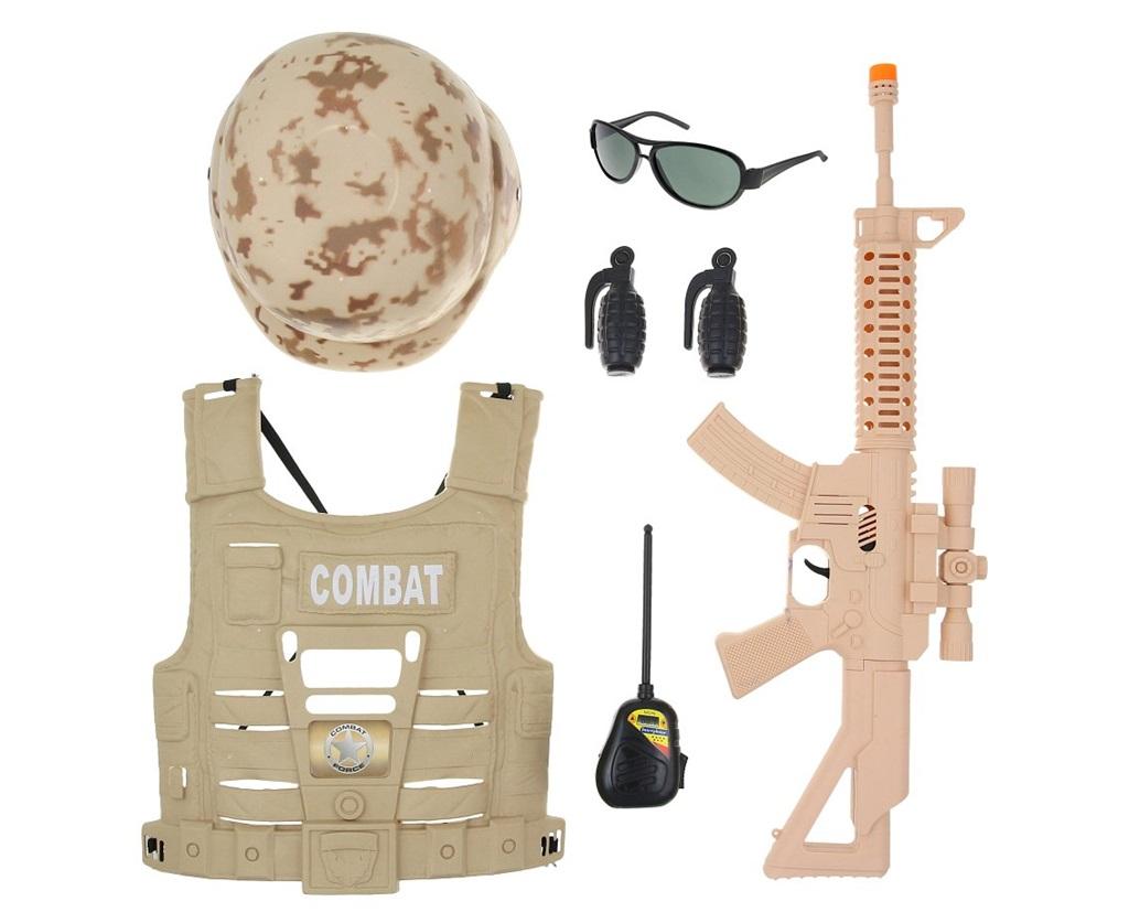 ZESTAW ŻOŁNIERZA (7 ELEMENTÓW) W skład zestawu wchodzą: kamizelka kuloodporna (ochrona balistyczna), dwa granaty, czarne okulary, hełm, atrapa krótkofalówki oraz karabinek z lunetą Obwód głowy: ok. 55 cm Wymiary kamizelki: 34x29 cm Kolor: beżowy Materiał: plastik