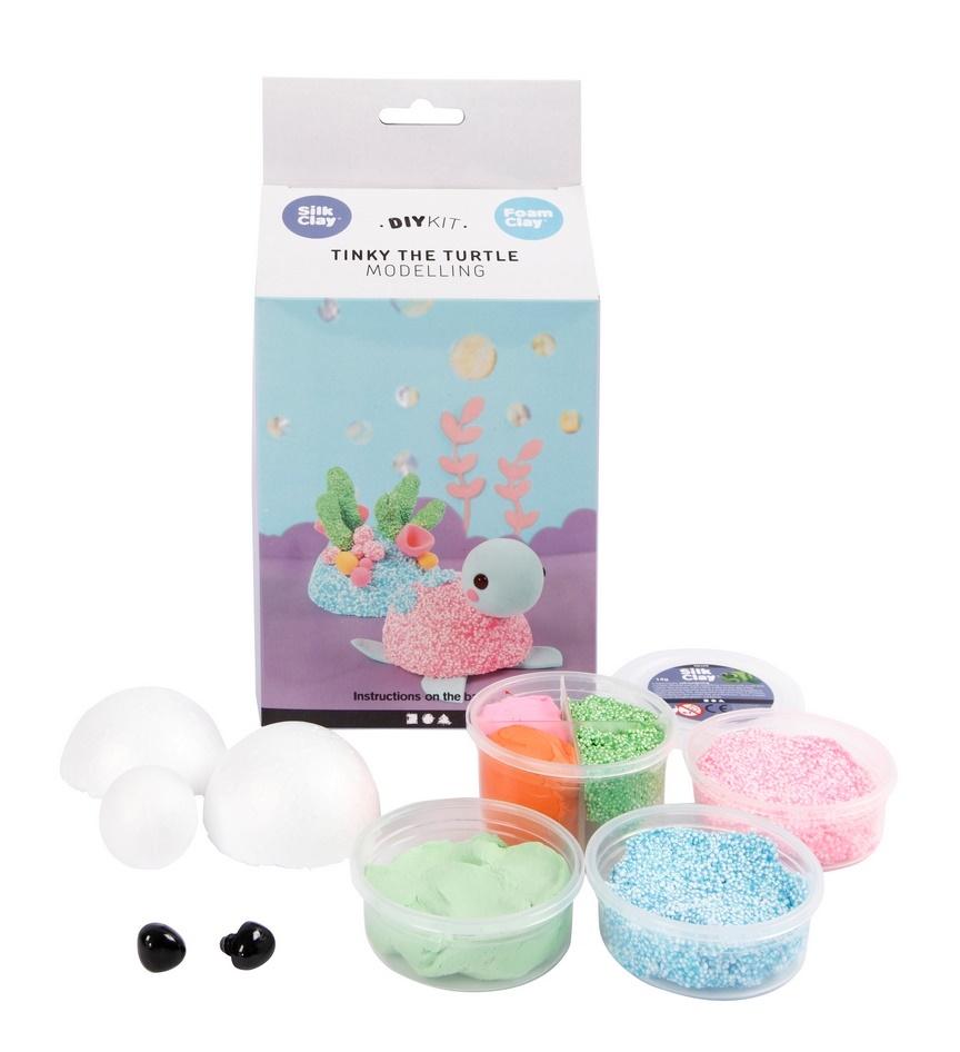 Zestaw ze wszystkimi materiałami potrzebnymi do stworzenia figurki żółwia przy użyciu jedwabistej masy plastycznej, piankowej masy plastycznej oraz innych akcesoriów