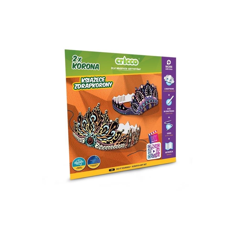 Książęce zdrapkorony to kreatywny zestaw z serii "Zrób to sam". W opakowaniu znajdziemy 2 wycięte korony w różnych kształtach z czarną wierzchnią warstwą. Za pomocą drewnianego rysika do zdrapywania, czyli patyczka, który znajduje się w zestawie, można wykonać dowolne wzory, dlatego ostateczny wygląd korony ogranicza tylko nasza kreatywność. W zestawie znajduje się również elastyczna gumka oraz ilustrowana instrukcja. Dostępne są dwa wzory koron a także karnawałowe i urodzinowe maski do zdrapywania. Na opakowaniu znajduje się też kod QR z odnośnikiem do bazy filmików DO IT YOURSELF z instrukcjami i inspiracjami do kreatywnych zabaw z użyciem produktów Cricco.