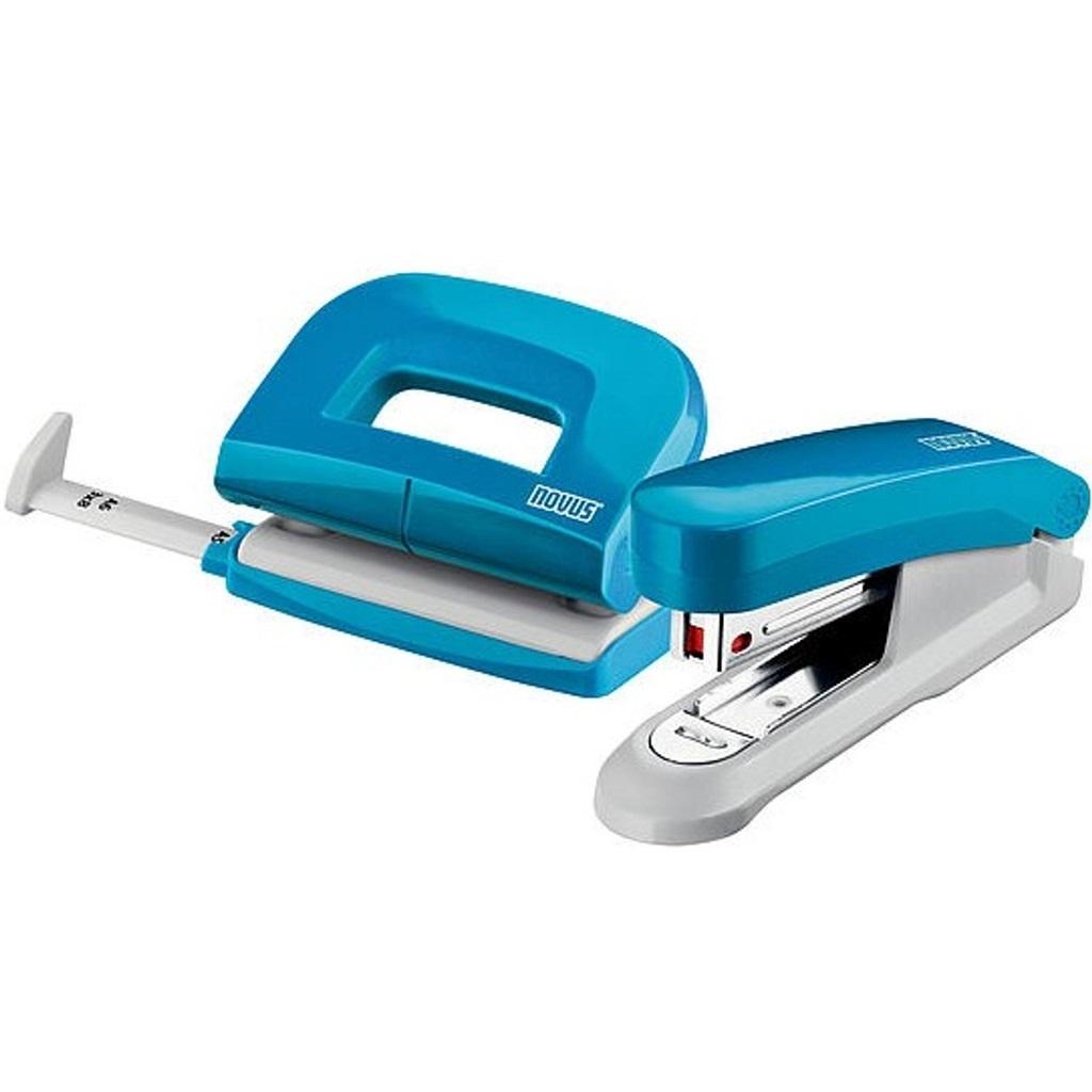 Elegancki zestaw Novus zszywacz E15 i dziurkacz E210. Metalowy zszywacz w obudowie z tworzywa sztucznego, posiada zintegrowany metalowy rozszywacz. Umożliwia zszywanie 15 arkuszy papieru 80g/m2 jednorazowo. Metalowy dziurkacz w obudowie z tworzywa sztucznego, posiadający czytelny i łatwo blokujący ogranicznik formatu. 10 lat gwarancji na zszywacz i 5 lat na dziurkacz. Kolor jasnoniebieski. Opakowanie blistrowe, w zestawie 1000 zszywek No.10.