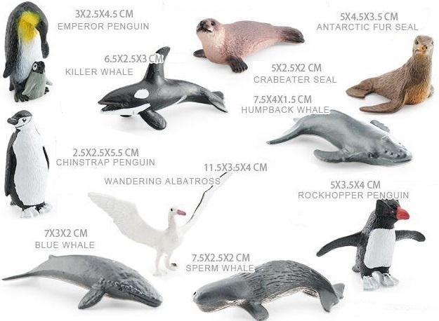 Wyrusz w podróż na odległą Antarktydę z naszym fantastycznym zestawem 10 realistycznych figurek zwierząt! Ten bogaty pakiet edukacyjny pozwoli Twojemu dziecku poznać różnorodność fauny mroźnych biegunów. W komplecie znajdziesz majestatycznego Pingwina Cesarskiego z pisklęciem, eleganckiego Pingwina Maskowego i charakterystycznego Pingwina Skalnego. Wśród morskich ssaków odkryjesz potężną Orkę, sprytnego Krabojada, uroczą Uchatkę Antarktyczną, gigantycznego Humbaka, tajemniczego Kaszalota oraz największego ssaka na Ziemi - Płetwala Błękitnego. Nad wodami Antarktydy unosi się majestatyczny Albatros Wędrowny. Każda figurka została wykonana z dbałością o detale, odzwierciedlając cechy charakterystyczne danego gatunku. Różnorodność rozmiarów (od ok. 2.5 cm do 11.5 cm długości) sprawia, że figurki są łatwe do manipulowania dla małych rączek i idealnie nadają się do tworzenia własnych scenariuszy zabaw. Ten zestaw to nie tylko źródło rozrywki, ale także doskonałe narzędzie edukacyjne, które rozwija wyobraźnię, ciekawość świata i wzbogaca wiedzę o zwierzętach. Idealny prezent dla każdego małego miłośnika przyrody!