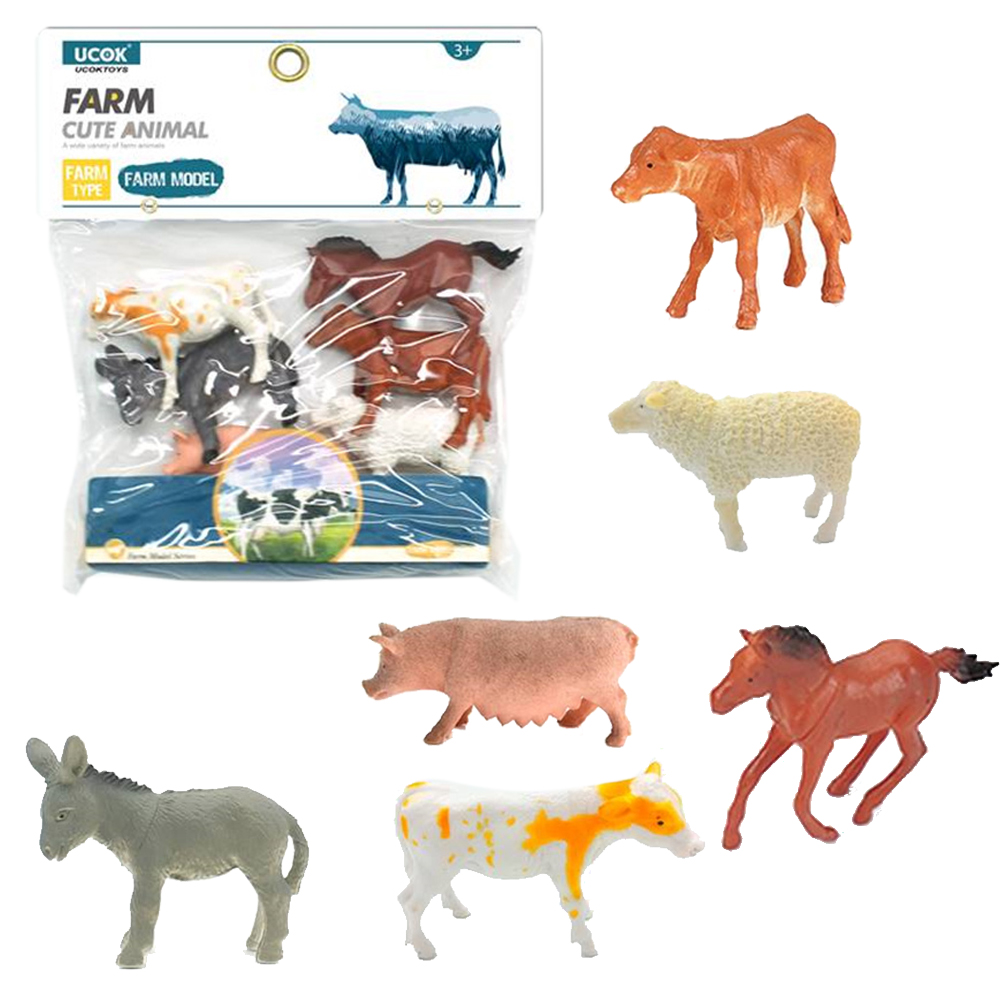 Zestaw zawiera 6 zwierzątek domowych: świnkę, owcę, konia, krówkę, cielaczka i osiołka. Wielkość zwierzątek około 10 cm.