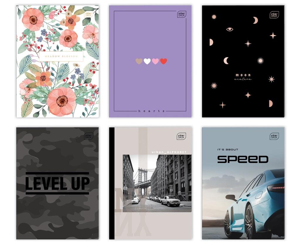 Zeszyt A4 w kratkę, 60 kartek, mix wzorów. 5 sztuk w opakowaniu zbiorczym. Producent Interduk.