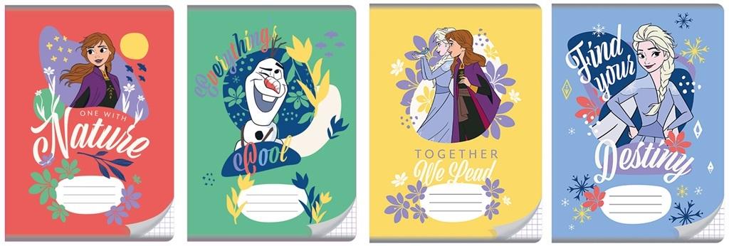 Zeszyt A5, posiada 16 kartek o gramaturze 70 g/m2 w kratkę. Charakteryzuje się estetycznym, lakierowanym wykończeniem i okładką z serii Frozen. Na zewnętrznej stronie okładki: imiennik - miejsce na wpisanie imienia, nazwiska, klasy.