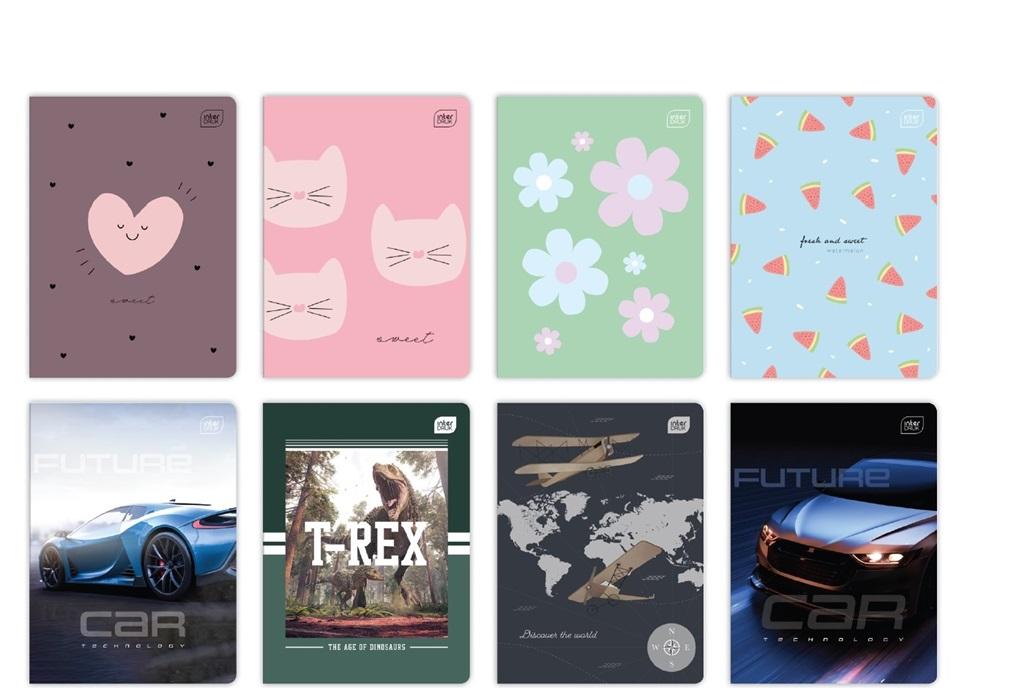 Zeszyt A5 kolorowa linia, 32 kartki, mix wzorów. 10 sztuk w opakowaniu zbiorczym. Producent Interdruk.