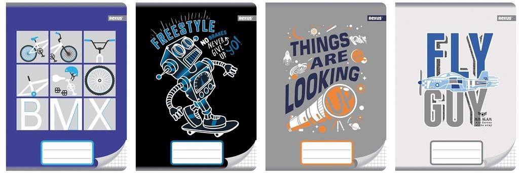 Zeszyt A5, posiada 32 kartki o gramaturze 70 g/m2 w kratkę. Charakteryzuje się estetycznym, lakierowanym wykończeniem i modną grafiką na okładce idealna dla chłopca. Na zewnętrznej stronie okładki: imiennik - miejsce na wpisanie imienia, nazwiska, klasy.