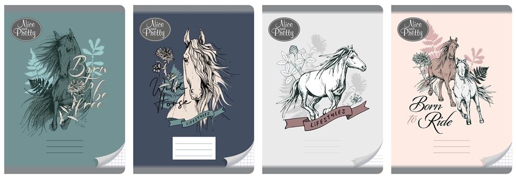 Zeszyt A5, posiada 32 kartki o gramaturze 70 g/m2 w kratkę. Charakteryzuje się estetycznym, lakierowanym wykończeniem i modną grafiką na okładce z serii Nice&Pretty. Na zewnętrznej stronie okładki: imiennik - miejsce na wpisanie imienia, nazwiska, klasy.
