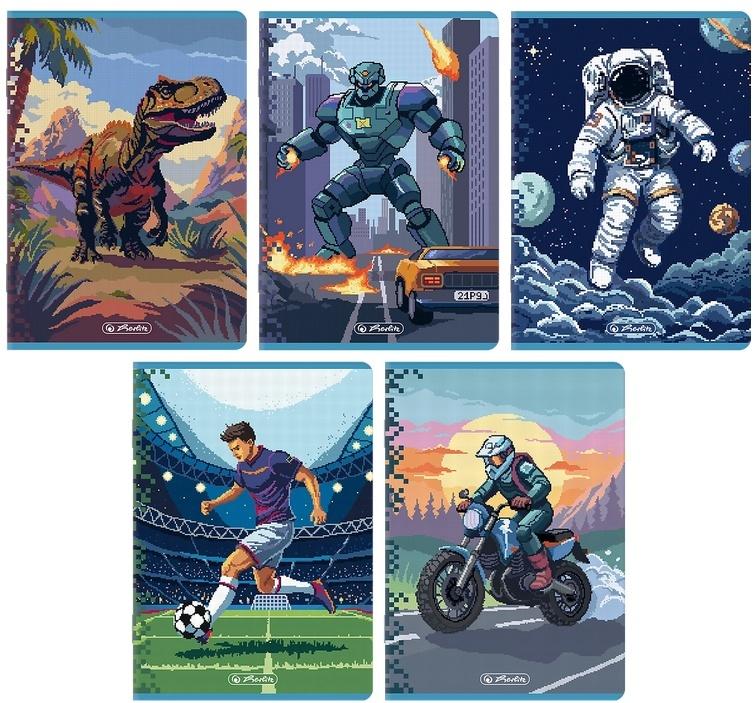 Zeszyty Herlitz Pixel Fun to energetyczna i nowoczesna kolekcja stworzona z myślą o młodszych użytkownikach i wszystkich fanach gier komputerowych oraz pikselowej grafiki retro. Okładki zdobią dynamiczne ilustracje w stylu pixel art, przedstawiające m.in. dinozaura, astronautę, sportowca, robota i motocyklistę pełne kolorów, ruchu i charakteru. Każdy wzór inspirowany jest światem przygód, sportu i technologii, co czyni kolekcję wyjątkowo atrakcyjną i pobudzającą wyobraźnię. Miękkie, kartonowe okładki zostały wykończone matową folią i uszlachetnione wybiórczym lakierem błysk, który podkreśla detale graficzne i nadaje całości efekt trójwymiarowej głębi. Wewnątrz znajduje się papier o gramaturze 70 g/m2, idealny do codziennego pisania i rysowania. Zeszyty Herlitz Pixel Fun to doskonałe połączenie jakości, stylu i młodzieżowego charakteru.