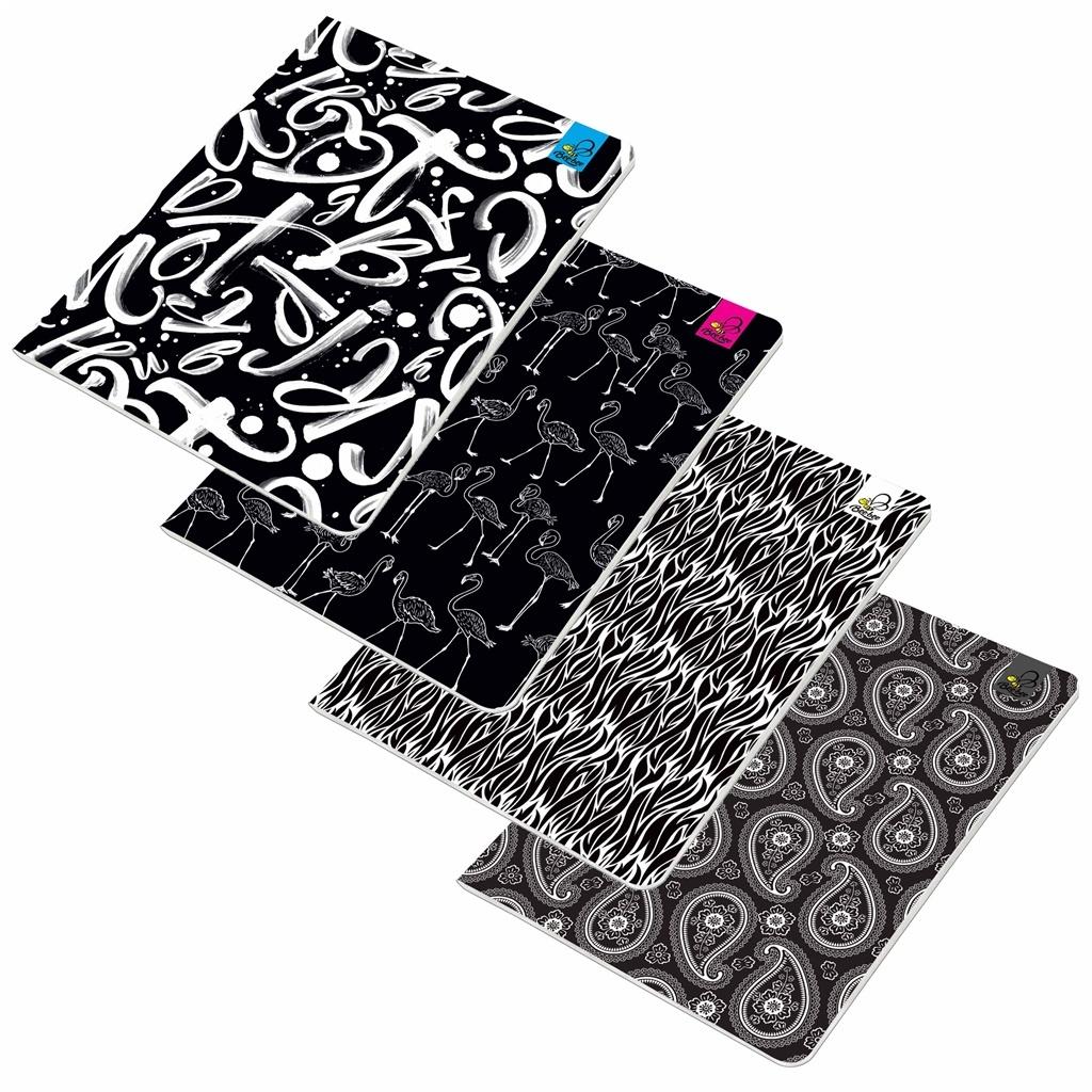 Zeszyt formatu A5, 60 kartek w kratkę, papier 70g, okładki laminowane, w spokojnej tonacji z czarno-białymi motywami.