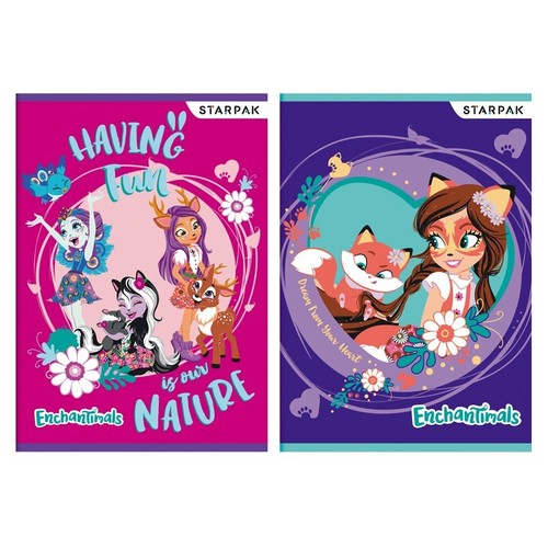 Zeszyt A5, 16 kartek w kratkę, w miękkiej oprawie. Oprawka zdobiona nadrukiem Enchantimals. Zeszyt dostępny w dwóch wersjach graficznych.
