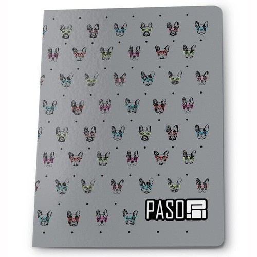 Zeszyt 60 kartkowy w kratkę A5 szary w pieski, niebieska kratka, czerwony margines, laminowany.