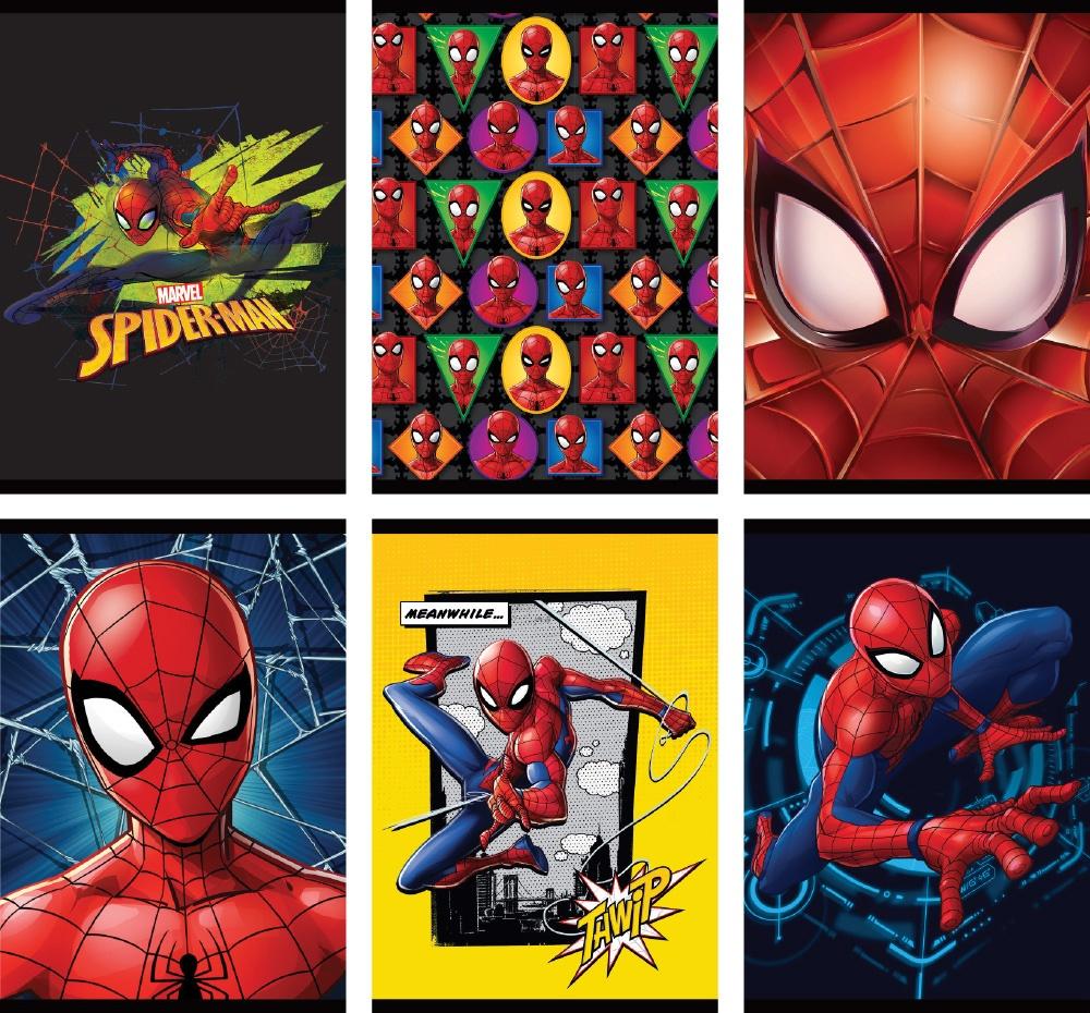 Zeszyt A5 w linie 54 kartki z okładką ozdobioną motywami Spider-Man Liniatura szara, bez marginesów. 10 sztuk, różne okładki.